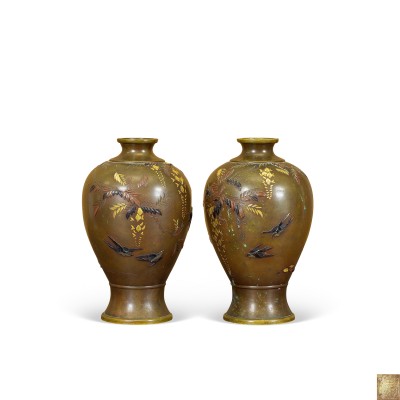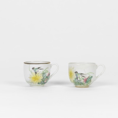 A Pair of Famille Rose Handled Cup with Birds and Flowers (Republic Period)
