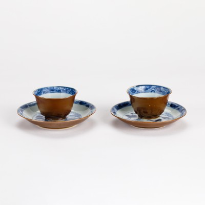 A Pair of Blue and White Persimmon-Glazed Cups and Saucers with Fruits and Flowers (Kangxi)