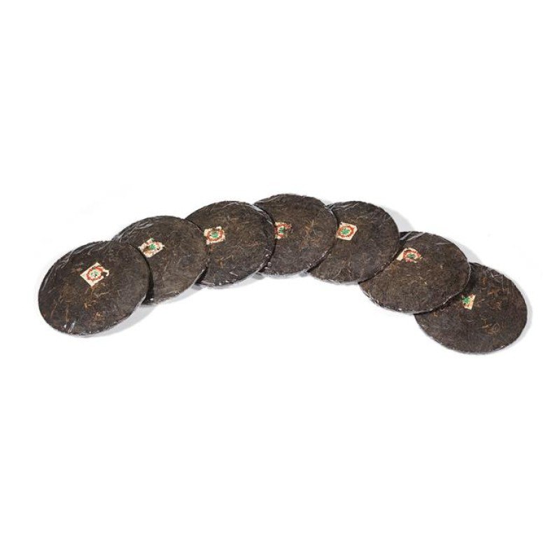 This Guangyun tribute cake is a set of seven pieces, with a complete shape and good quality. The tea cakes all come with an inner fly. The shape of the ticket is square with eight green tea characters, and the size is relatively small. Guangyun Gong Cake is made from large-leaf tea leaves. The tea is delicate and oily. It is pressed with an iron mold and has a tight cake shape.